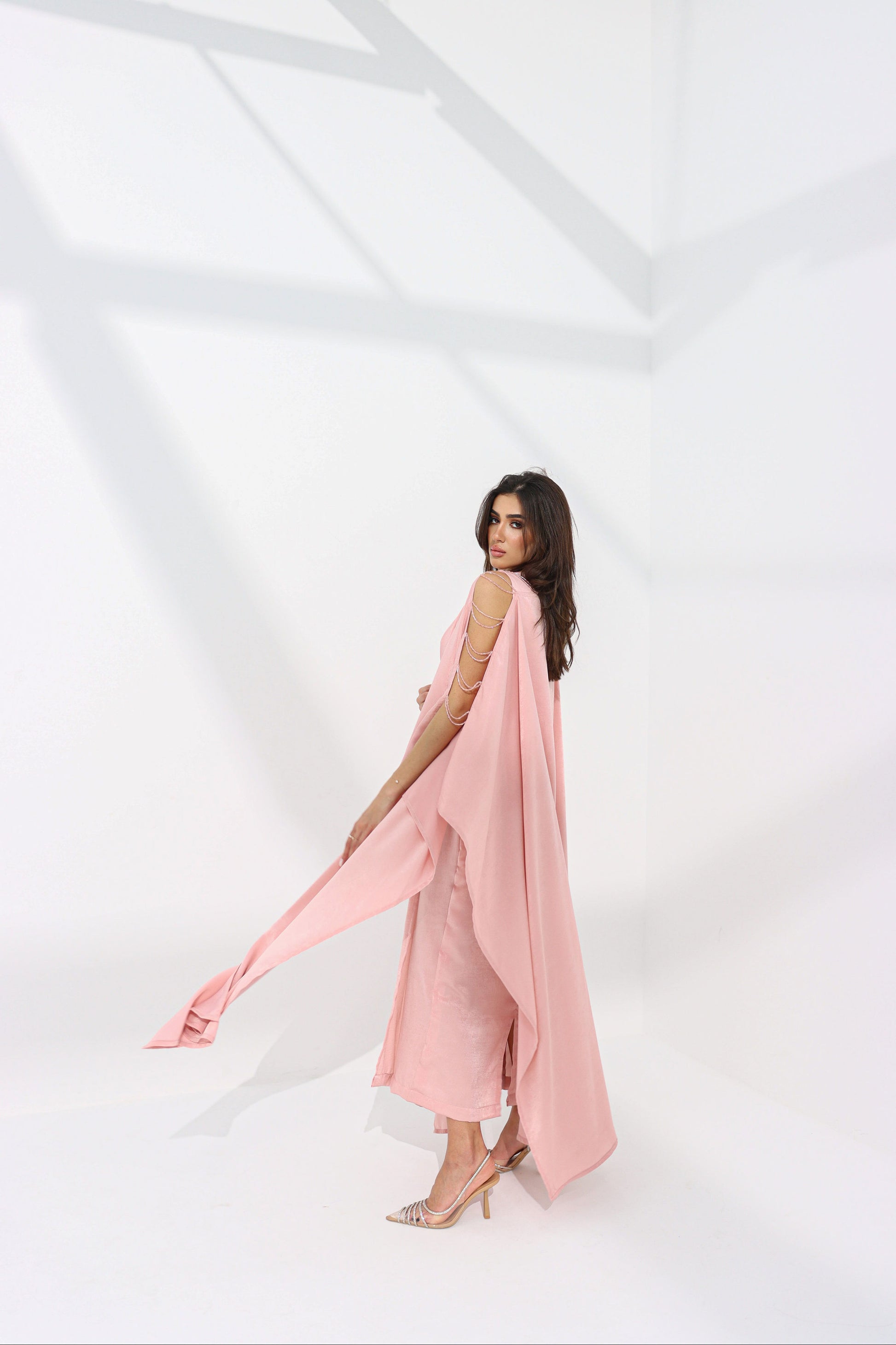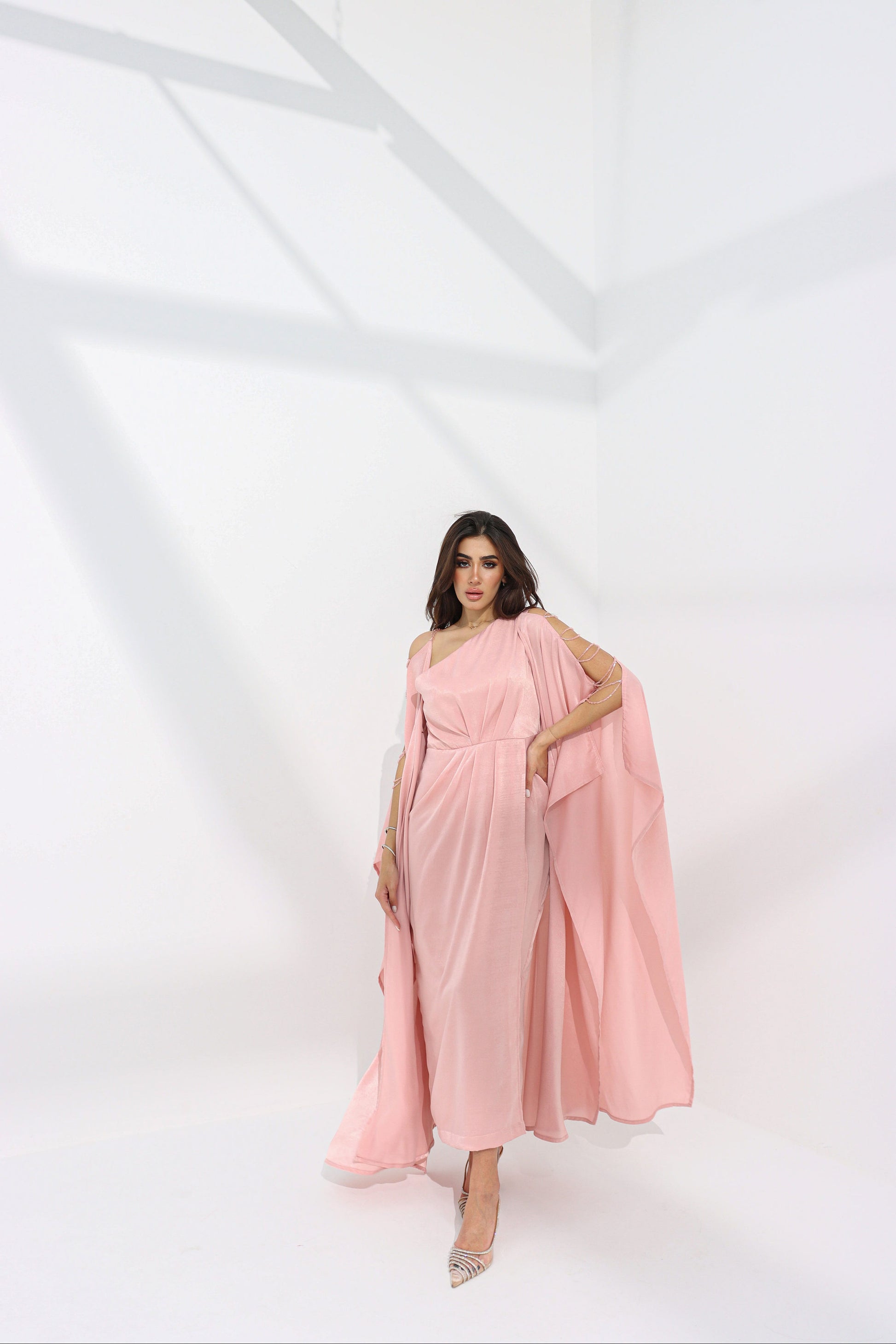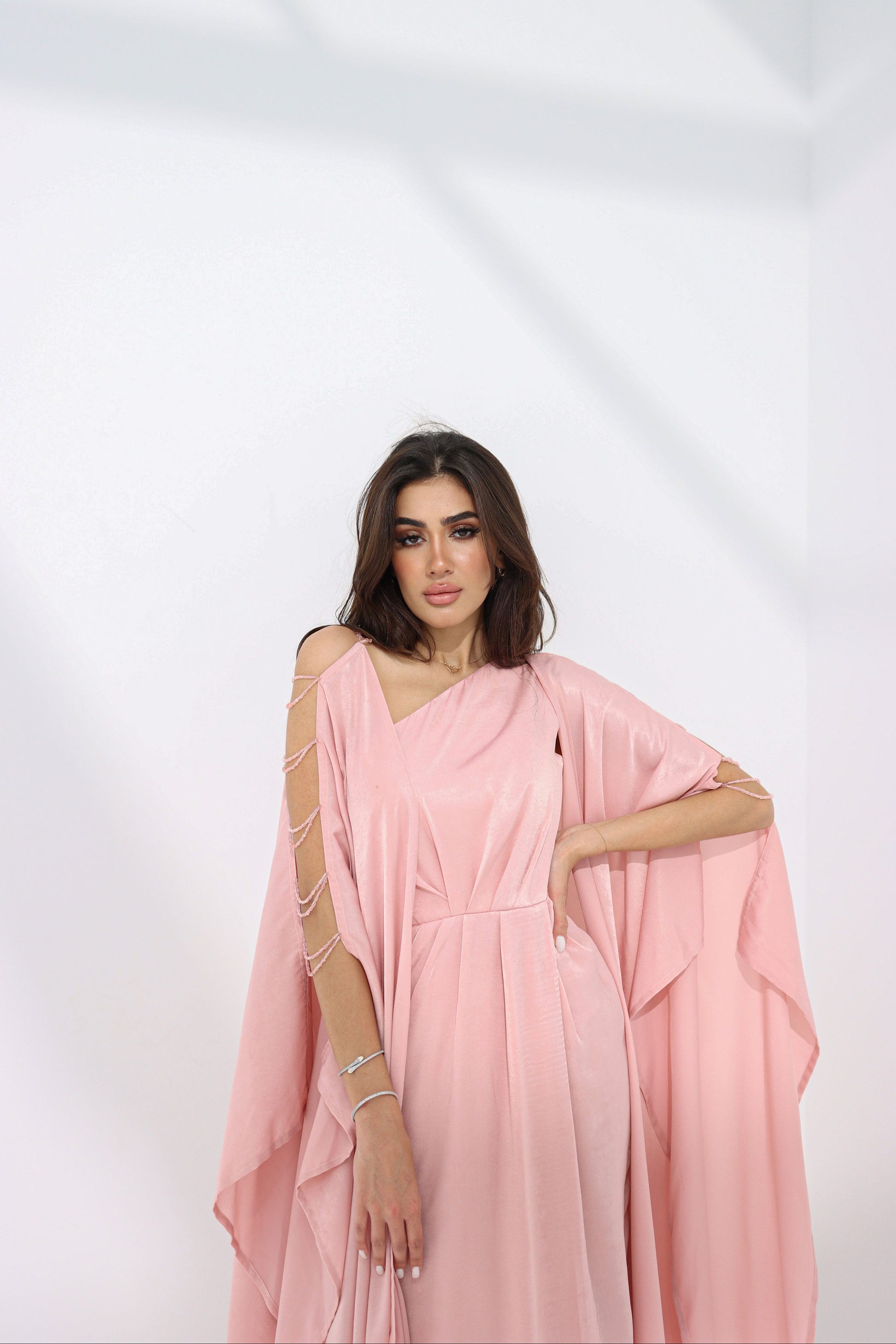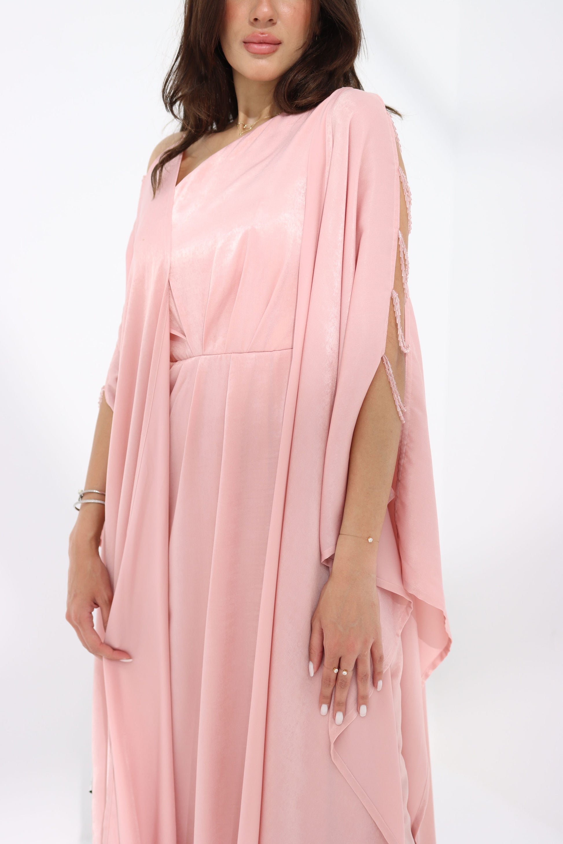 Elegant dress with an inner dress and cape with beads on the sleeve.